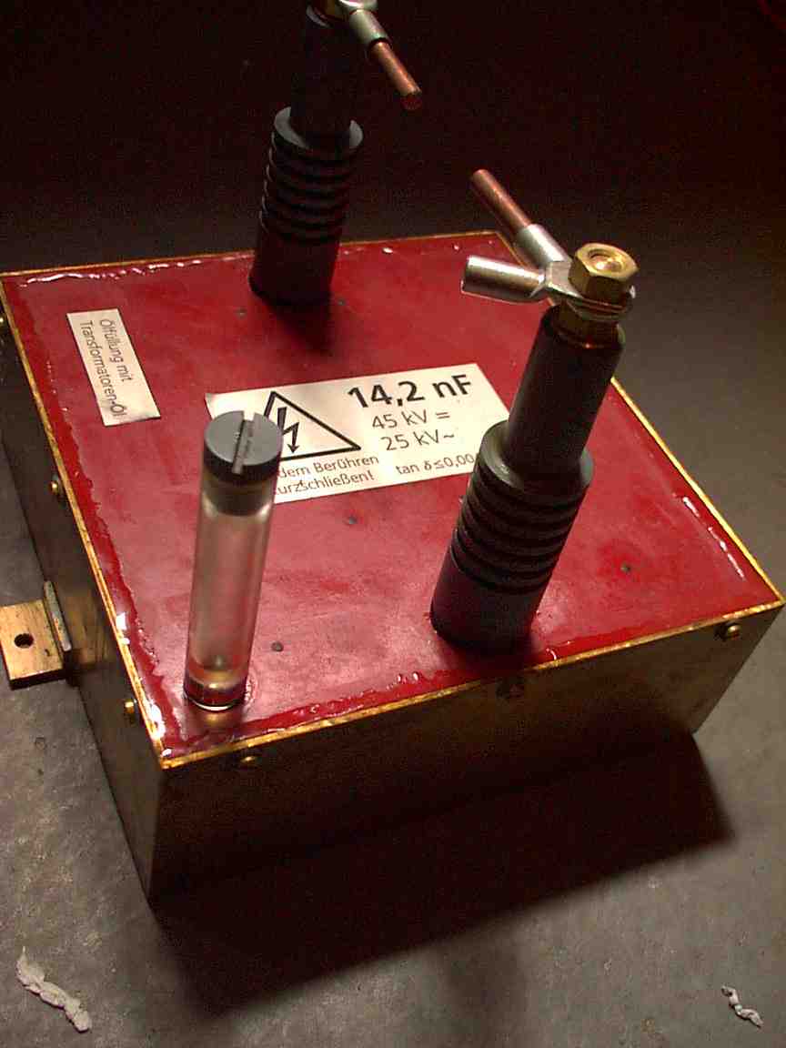 Er besteht aus 0,3mm starken Aluminiumplatten und einem Dielektrikum aus Mylar-Folie. Dadurch besitzt er einen sehr niedrigen Verlußtfaktor. Der Kondensator ist außerdem mit Trafoöl getränkt. Der Kondensator ist in einem stabilen Messinggehäuse untergebracht.