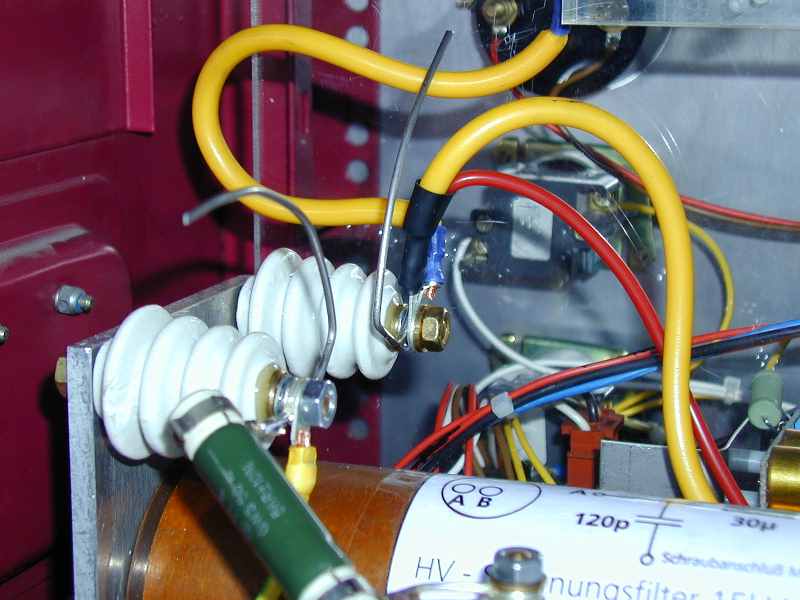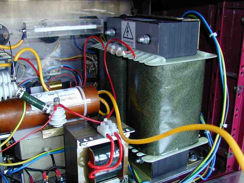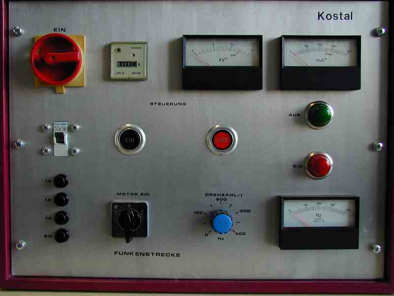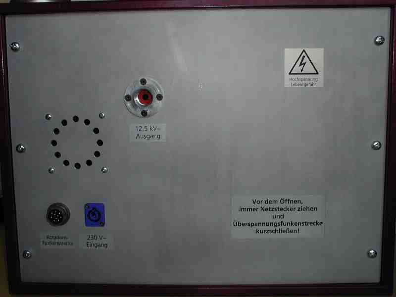 Die Versorgungseinheit ist in einem äußest robusterm Metallgehäuse untergebracht. Sie umfasst den Hochspannungstrafo, der extra für diese Anwendung hergestellt wurde, und aus sehr hochwertigen Materialien besteht. Eine Vorschaltdrossel , sowie eine elektronische Softstart-Schaltung, die ein problemloses Einschalten des Trafos am normalen Hausnetz ermöglicht. Eine elektronische Überstromabschaltung, die bei zu großer Belastung den Trafo sofort abschaltet. Auf der Sekundärseite ist ein Hochspannungsfilter eingebaut und eine Hochspannungs-Funkenstrecke, die eine eventuelle Rückspannung ableitet und den HV-Trafo schützt. Der Anschluß der Hochspannung erfolgt über eine HV-Buchse, mit entsprechendem mitgeliefertem HV-Kabel und dem entsprechenden Stecker. Die Ausgangsspannung und der Ausgangsstrom werden durch Drehspulinstrumente Angezeigt. Sämtliche elektrischen Komponenten sind durch gut zugängliche Sicherungen abgesichert. Die Absicherung der gesamten Einheit erfolgt mit einem Sicherungsautomaten.