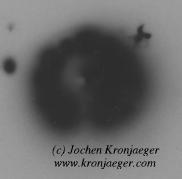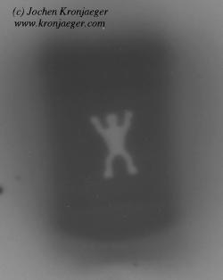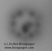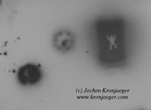 This image was produced with an x-ray film that was wrapped light-proof with aliminium foil. I put three radioactive sources directly on the wrapped film and left them there for three days. The film was then developed in the usual way. The three sources were (from left to right):