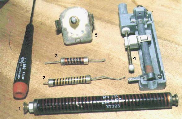 1: 220MOhm HV Resistor from some kind of old monitor 2: 200MOhm Resistor from TV 3: 5MOhm Resistor from TV 4: so-called "focus rod", high-resistance poti to adjust the electron beam focus, voltage around 8kV 5: another high-resistance poti for focussing