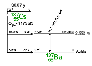 Now measure the efficiency. (SUGGESTION: Use the bare tube on a foam platform with as large a separation between the source and detector as permits a reasonable count rate.) Consider the effects of "background". To calculate the total emission from the source you will need an understanding of the 137Cs decay scheme (See "'Internal Conversion", in any of References 1-3), the strength of the source, its half - life, and the calibration date. (Data on last page of the Primer On The Effects Of Exposure To Ionizing Radiation ) How well do the calculated and measured values agree? The decay schemes of several frequently used sources are provided in Appendix . See also the Guide to the TABLE OF ISOTOPES. Would a correction for the shape of the wall be significant?