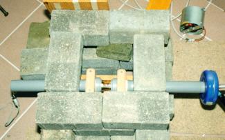 Heap of concrete blocks with tube inside, HV supply (green cascades) and voltmeter (black tube).